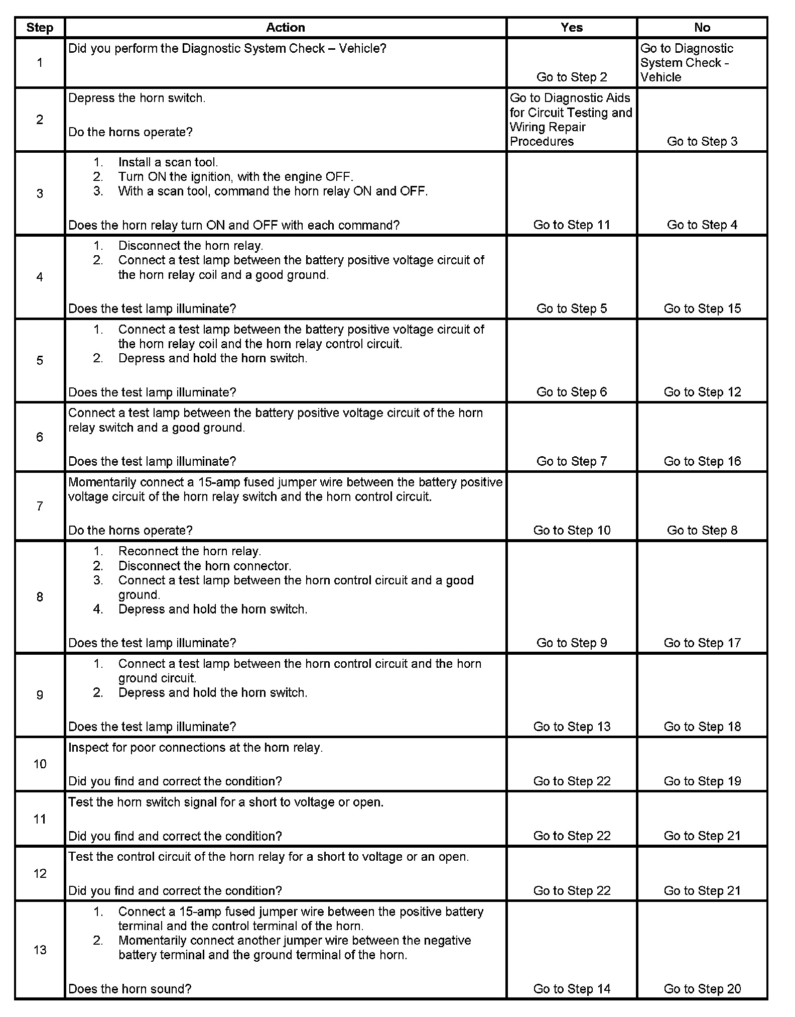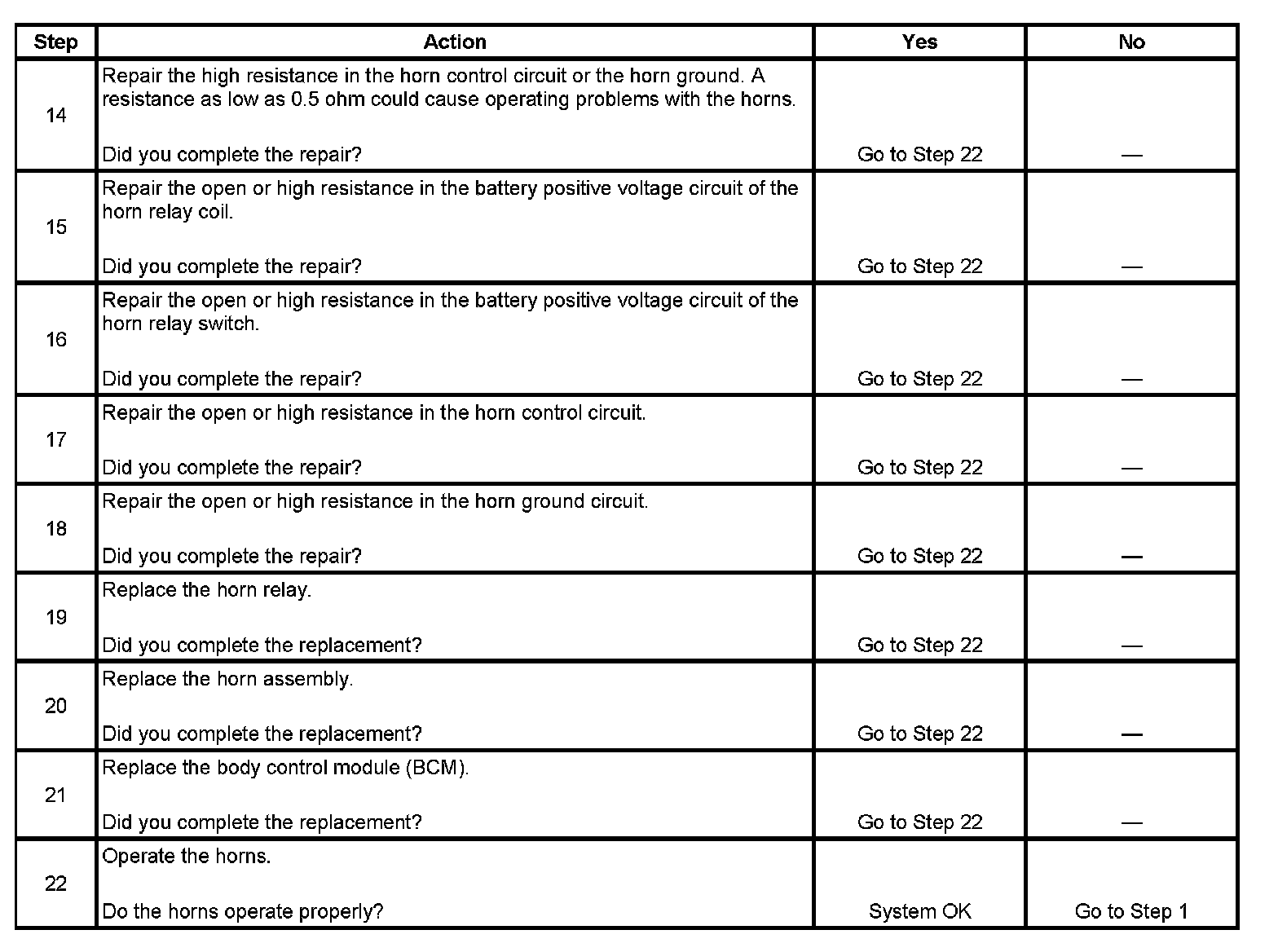 14. The horns need maximum current flow to operate properly. A high resistance, greater than 0.5 ohm, in the horn control circuit or the horn ground circuit could cause operating problems with the horns. Inspect the circuits for faults that would restrict current flow.