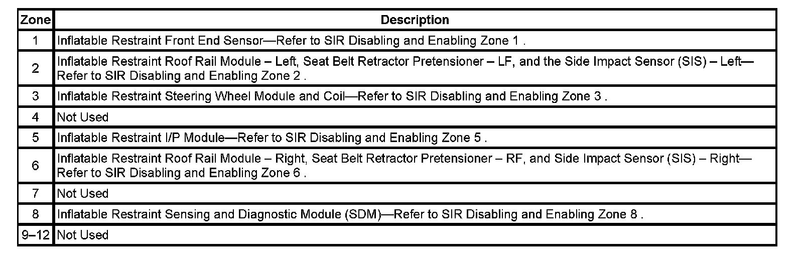 The SIR system has been divided into Disabling and Enabling Zones. When performing service on or near SIR components or SIR wiring, it may be necessary to disable the SIR components in that zone. It may be necessary to disable more than one zone, depending on the location of other SIR components, and the area being serviced. Refer to SIR Zone Identification Views. Refer to the illustration, to identify the specific zone or zones in which service will be performed. After identifying the zone or zones, proceed to the disabling and enabling procedures for that particular zone or zones.