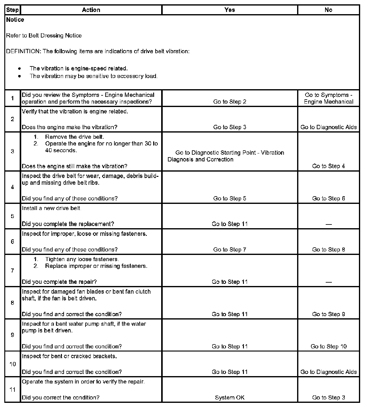 3. This test is to verify that the drive belt or accessory drive components may be causing the vibration. When removing the drive belt the water pump may not be operating and the engine may overheat. Also DTC's may set when the engine is operating with the drive belt removed.