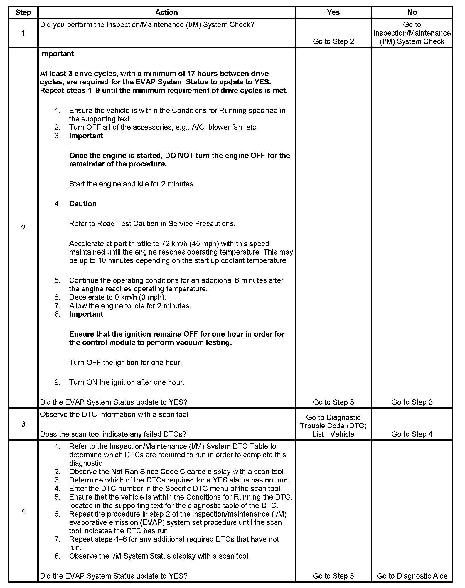 The purpose of this procedure is to satisfy the enable criteria necessary to execute inspection/maintenance (I/M) readiness diagnostics for the evaporative emission (EVAP) system. The procedure may be used to set the EVAP I/M System Status display on the scan tool to YES. The EVAP I/M System Status display indicates whether or not the control module has completed the readiness diagnostics. The readiness diagnostics complete when all DTCs comprising the diagnostics run and pass, or any DTC comprising the diagnostics illuminates the malfunction indicator lamp (MIL). If the diagnostics pass during one drive cycle, 17 hours must elapse, regardless of whether the vehicle is driven or not. Then, the diagnostics will run again during the next drive cycle in which the conditions for running are met. Once the diagnostics have passed during the third drive cycle, the EVAP I/M System Status display will be updated to YES. A failed or aborted diagnostic will require the vehicle to cool down in order to meet the enable criteria for another drive cycle. Therefore, performing a visual inspection prior to running the EVAP test may prevent having to repeat the drive cycle.