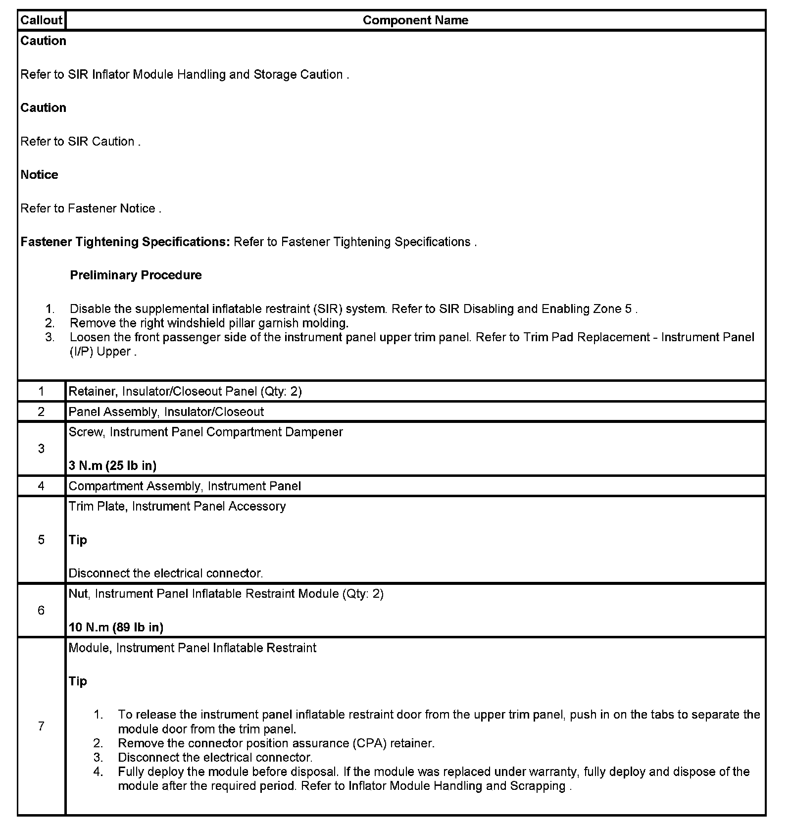INFLATABLE RESTRAINT INSTRUMENT PANEL MODULE REPLACEMENT