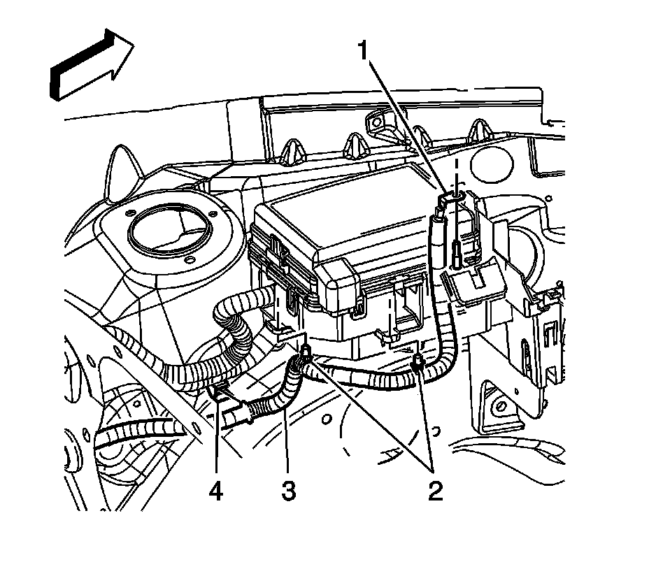 6. Remove the positive battery cable clips (3, 4) from the studs.
