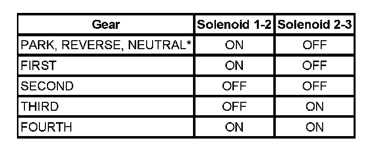 The solenoid states are normally ON (1-2) and OFF (2-3) in the P, R, and N gears. However, these may change based on the vehicle speed and the throttle position.