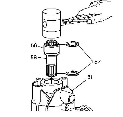 10. Install the 2 new snap rings (57) on the stub shaft (58). The snap rings (57) are not reusable after you remove the shaft (58).