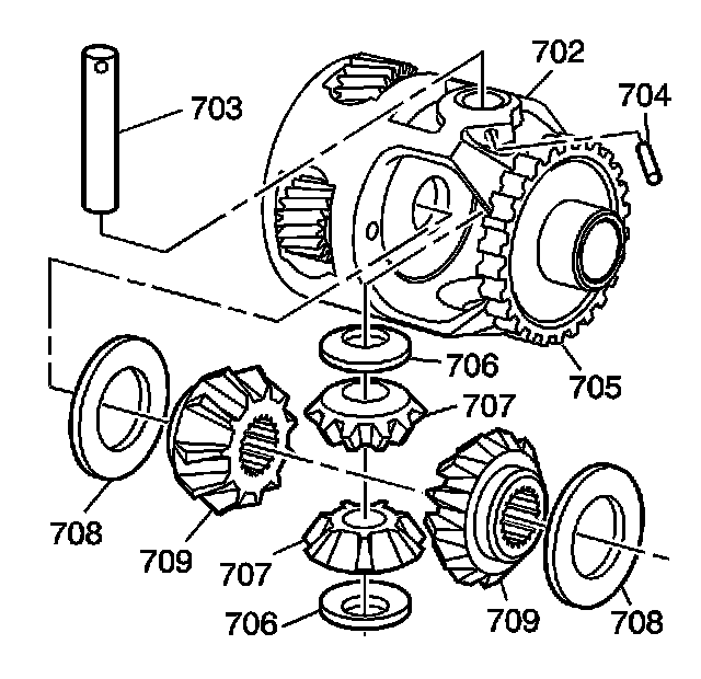 4. Remove the differential pinion gears (707), thrust washers (706), the differential side gears (709), and the thrust washers (708).