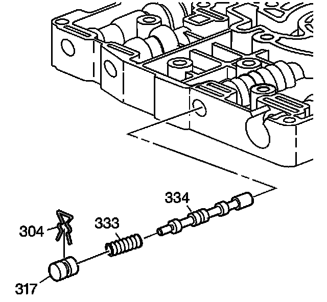 8. Remove the TCC control valve retainer clip (304), the bore plug (317), the spring (333), and the TCC control valve (334).