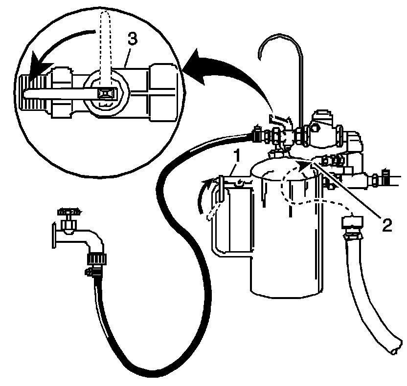 6. Turn the J 35944-A water supply valve (3) to the OFF position and clip the discharge hose onto a 19 liter (5 gallon) pail with a lid, to avoid splashback.