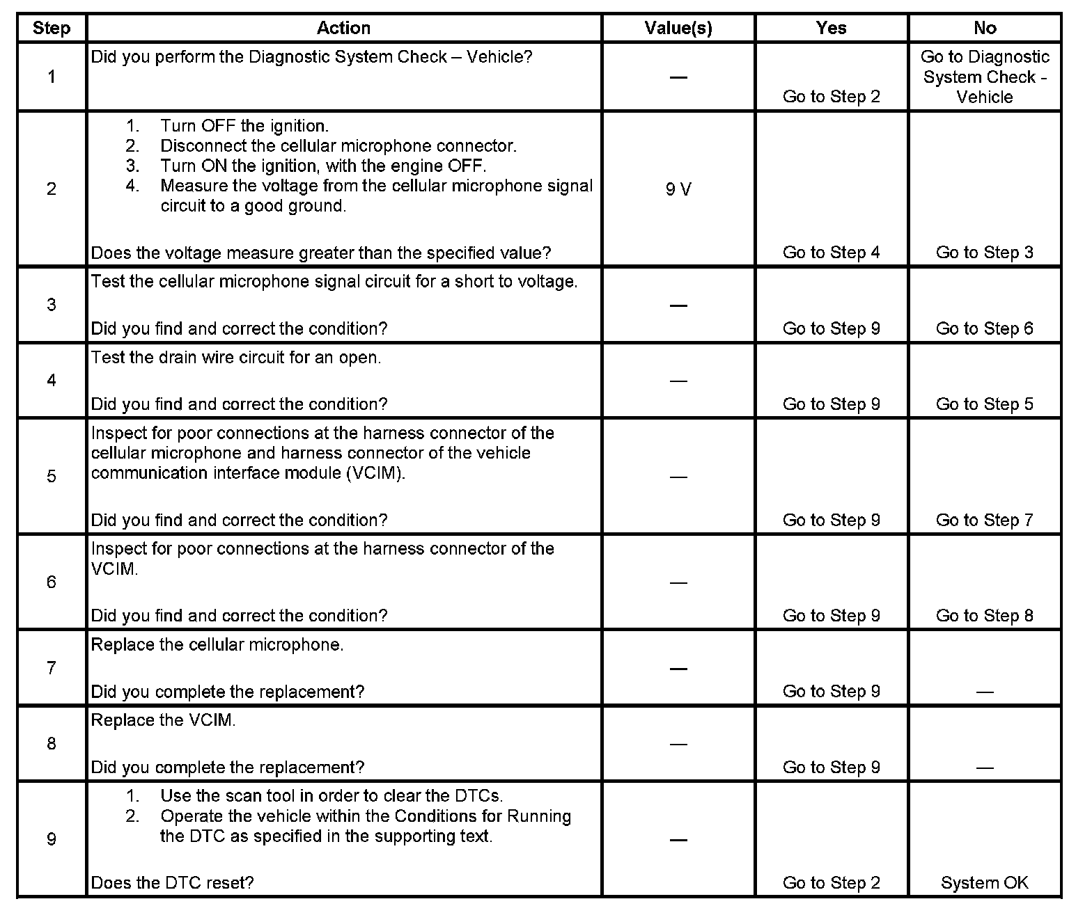 - The VCIM detects an open in the cellular microphone low reference circuit or a short to voltage in the cellular microphone signal circuit.