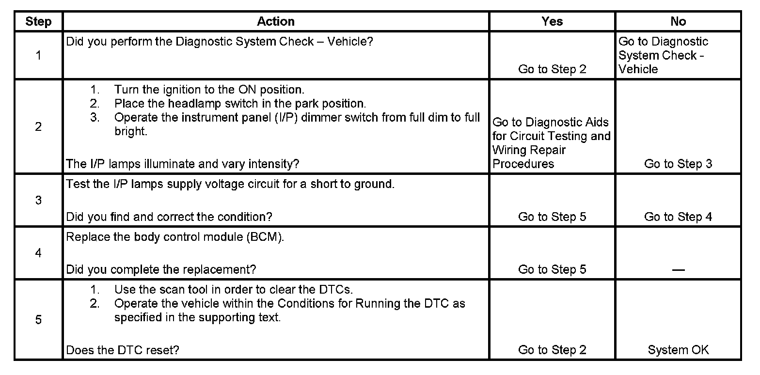 The body control module (BCM) monitors the instrument panel (I/P) lamps dimming control circuit to determine the lighting intensity of the I/P lamps. When the BCM receives a varied voltage signal on the I/P lamps dimming control circuit, it applies a corresponding pulse width modulated (PWM) voltage signal through the I/P lamps supply voltage circuit to all the I/P lamps.