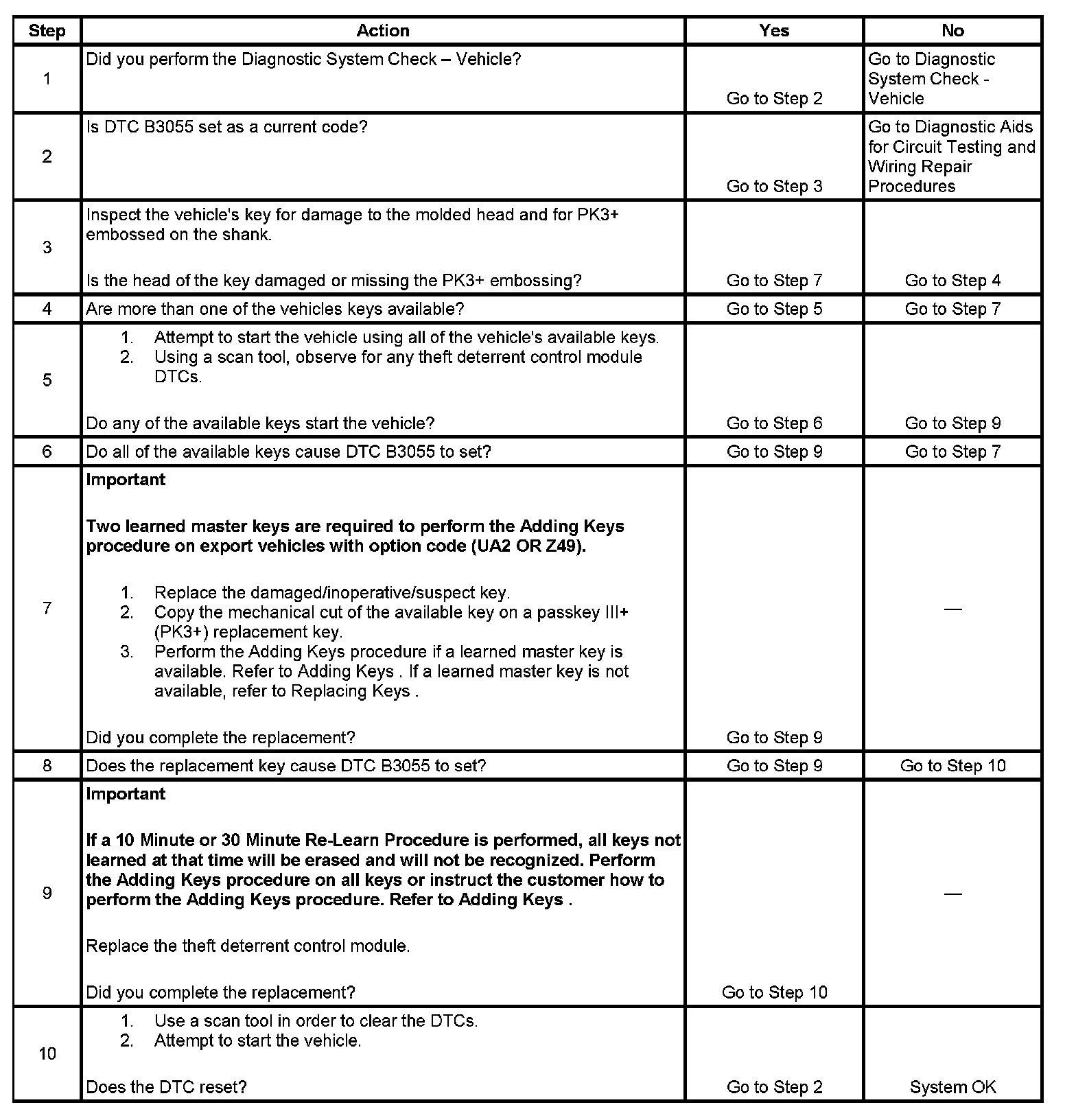 7. If a new key must be tried, the key must have the proper mechanical cut and the theft deterrent control module must "learn" the transponder value.
