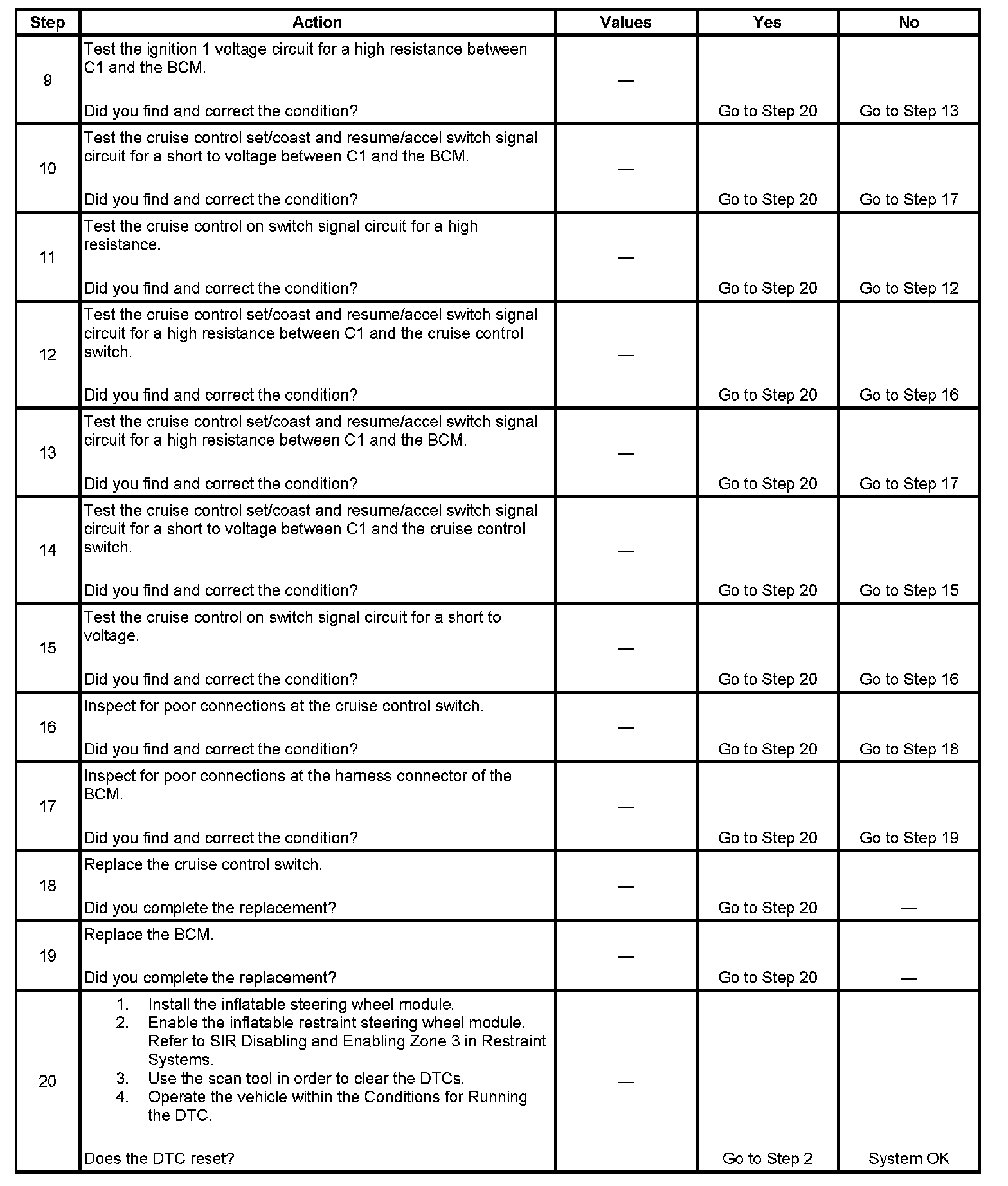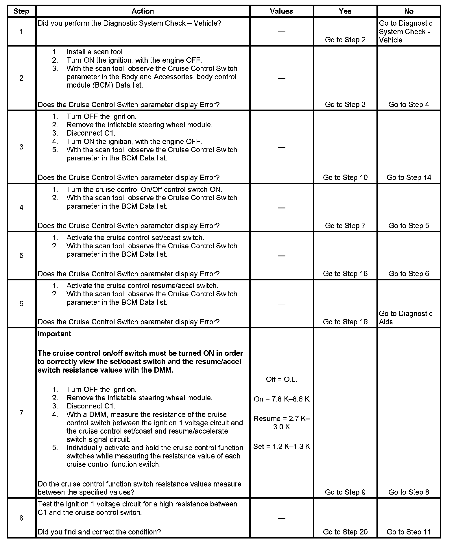 - Rotate the steering wheel to both steering stops and activate each cruise control switch separately. With a scan tool, observe the Cruise Control Switch parameter in the Body and Accessories, BCM Data list. This will help eliminate the possibility of a internally open or shorted inflatable restraint steering wheel module coil.