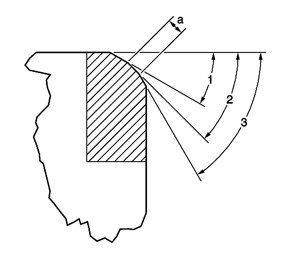 3. Grind the valve undercut surface to the proper angle specification (3) listed in Engine Specifications Mechanical to narrow the valve seating surface width (a) to the specifications listed in Engine Specifications Mechanical.