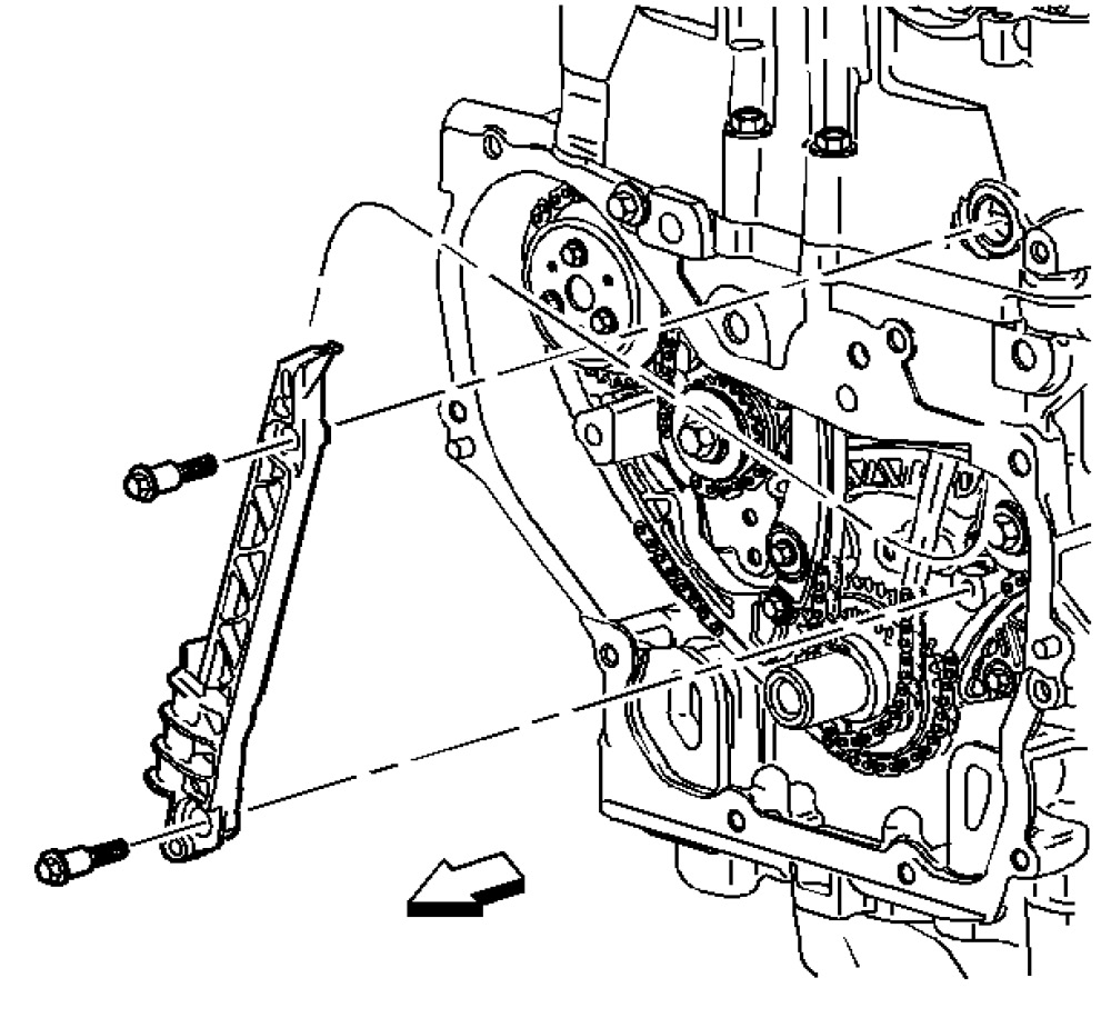 19. Install the fixed timing chain guide and bolts. Tighten the fixed timing chain guide bolts to 10 Nm (89 lb in).