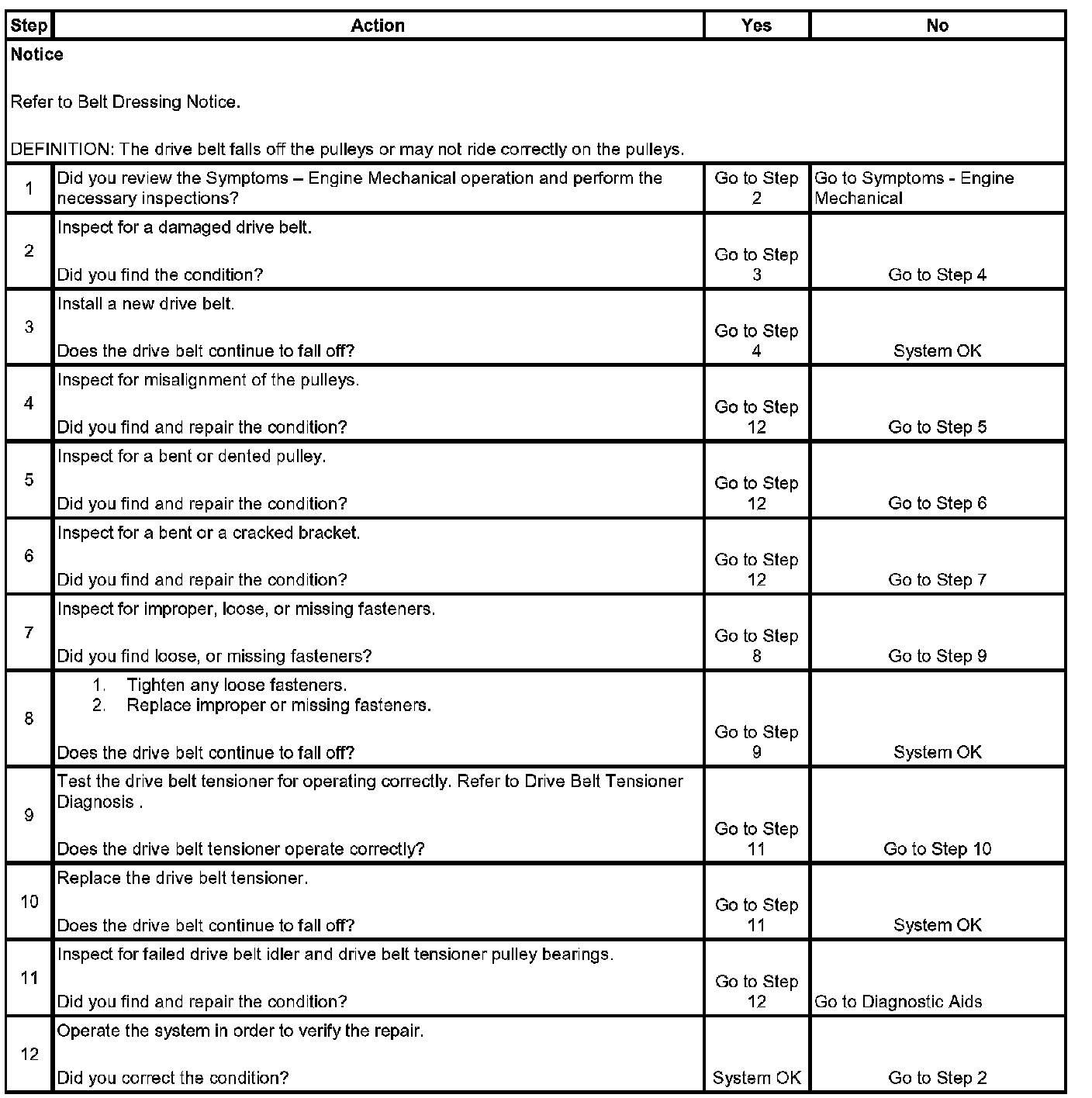 An extra load that is quickly applied or released by an accessory drive component may cause the drive belt to fall off the pulleys. Verify the accessory drive components operate properly.