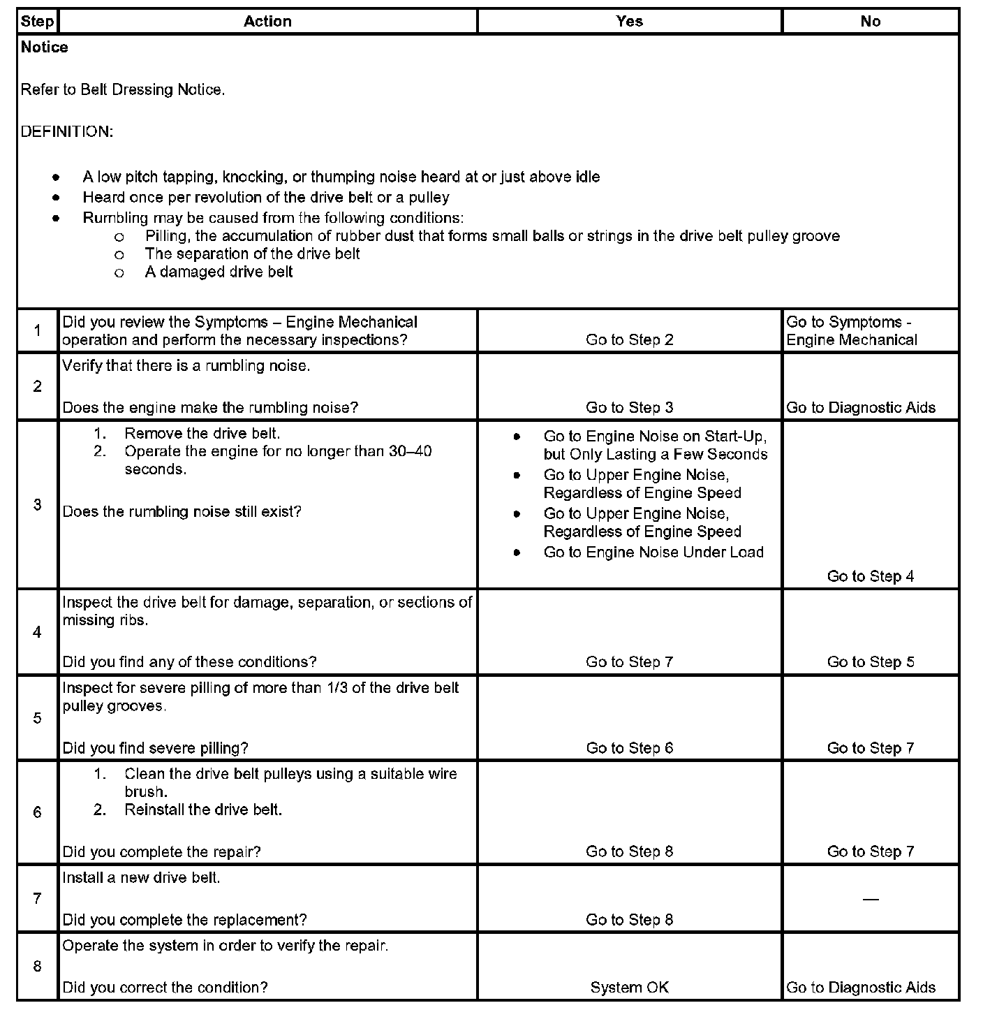 3. This test is to verify that the drive belt is causing the rumbling noise. A rumbling noise may be confused with an internal engine noise due to the similarity in the description. Remove only one drive belt at a time if the vehicle has multiple drive belts. When removing the drive belt, the water pump may not be operating and the engine may overheat. Also DTC's may set when the engine is operating with the drive belt removed.