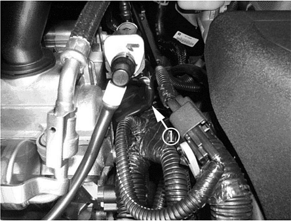 The condition may be caused by one of the wires in the main engine harness being chafed or cut on the evaporative emission canister purge solenoid valve mounting bracket (1).