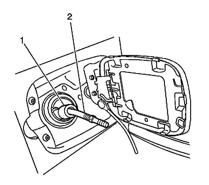 4. Continue to insert the J 43290 (2) into the fill pipe until the hose exits the valve (1) and reaches the bottom of the tank.
