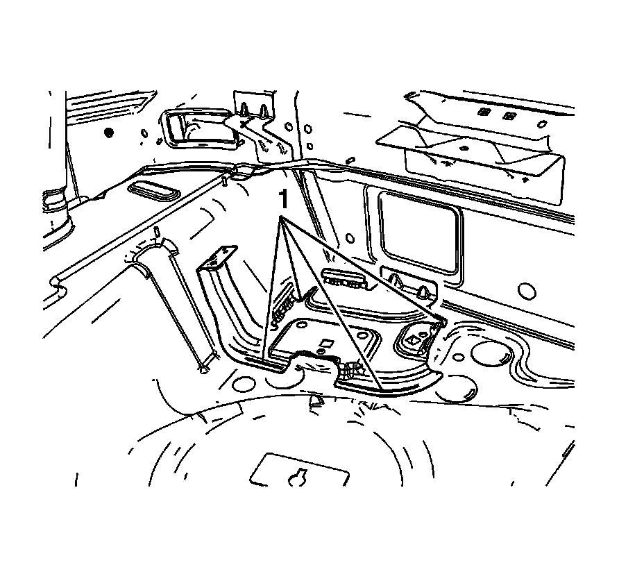 7. Structural adhesive is present at the joint between the battery tray and the rear floor pan. Heat the battery tray at the locations shown with a small flame from an oxy-acetylene torch to release the bond to the rear floor panel.