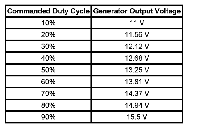 The engine control module (ECM) controls the generator through the generator L-terminal control circuit. The signal is a 5-volt pulse width modulation (PWM) signal of 128 Hz with a duty cycle of 0-100 percent. Normal duty cycle is between 5-95 percent. Between 0-5 percent and 95-100 percent are for diagnostic purposes. The table shows the commanded duty cycle and output voltage of the generator.