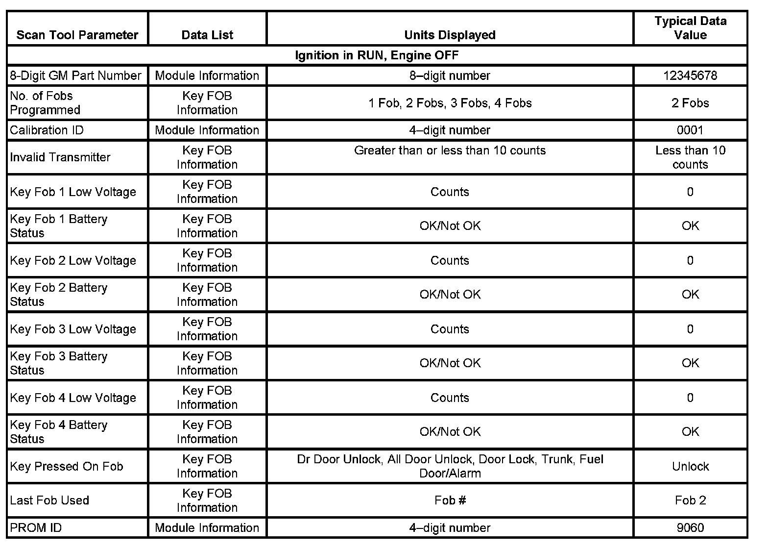 The Keyless Entry Scan Tool Data List contains all of the keyless entry related parameters that are available on the scan tool. The parameters in the list are arranged in alphabetical order. The column, "Data List," indicates the location of the parameter within the scan tool menu selections. Use the Keyless Entry Scan Tool Data List as directed by a diagnostic table or in order to supplement the diagnostic procedures. Begin all of the diagnostic procedures with Diagnostic System Check - Vehicle in Vehicle DTC Information.