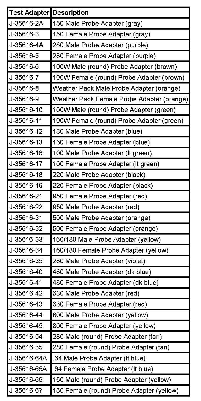 IMPORTANT: When probing female .64 terminals, it is important to use the correct adapter. There have been some revisions to the test adapter for 0.64 terminals. The proper adapter for .64 terminals is the J 35616-64A which has a tin terminal and a blue wire between the base and tip. Failure to use the proper test adapter may result in damage to the terminal being tested and improper diagnosis.