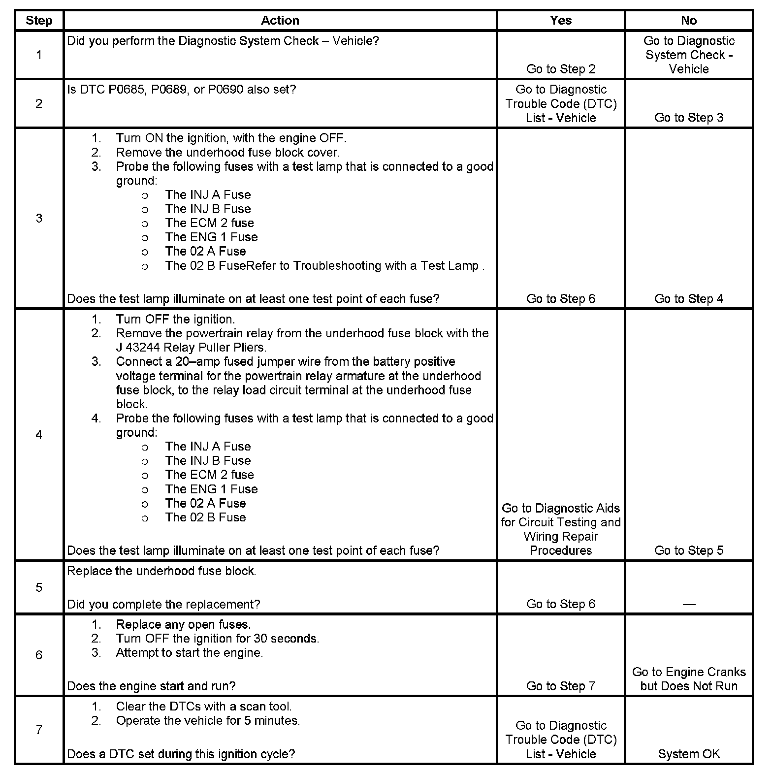 When the ignition switch is turned to the OFF position, power is interrupted to the ODM in the ECM and the powertrain relay electromagnetic field collapses. This action allows the spring tension pulling on the armature to separate from the relay load circuit contact, which interrupts current flow to the fuses. If the powertrain relay fails to close, the engine will crank but will not run. The GMLAN and class II data communications will be available with the use of a CANdi module and scan tool. The powertrain relay will remain powered up for 5 seconds after the ignition switch is turned OFF. The powertrain relay system diagnosis table assumes that the vehicle battery is fully charged. Refer to Battery Inspection/Test (Non-HP2). Battery Inspection/Test