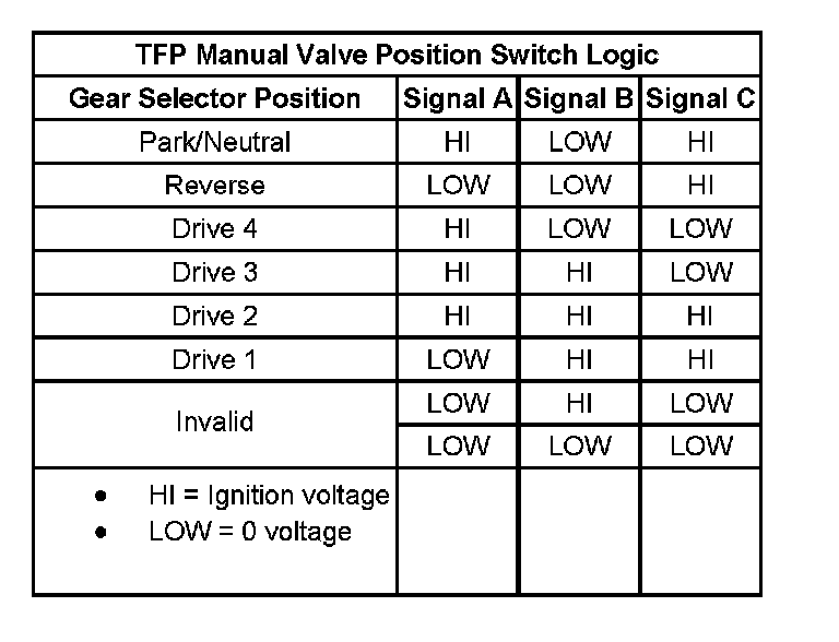 Transmission Fluid Pressure (TFP) Manual Valve Position Switch Logic: