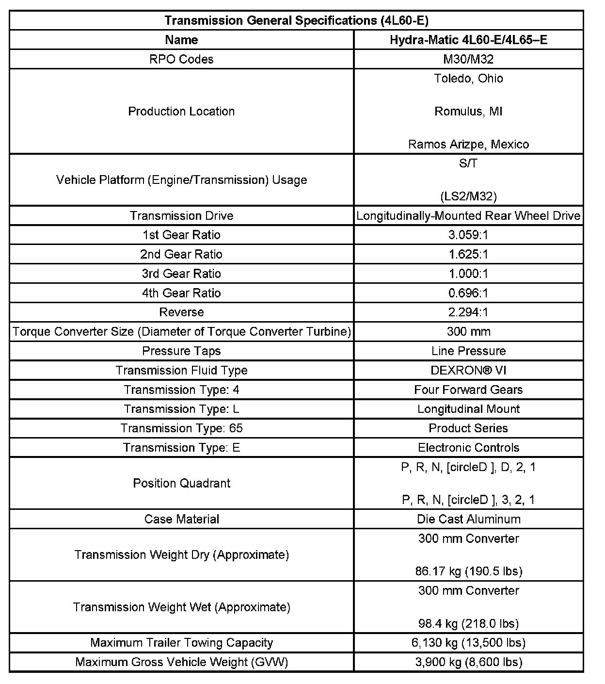 Transmission General Specifications: