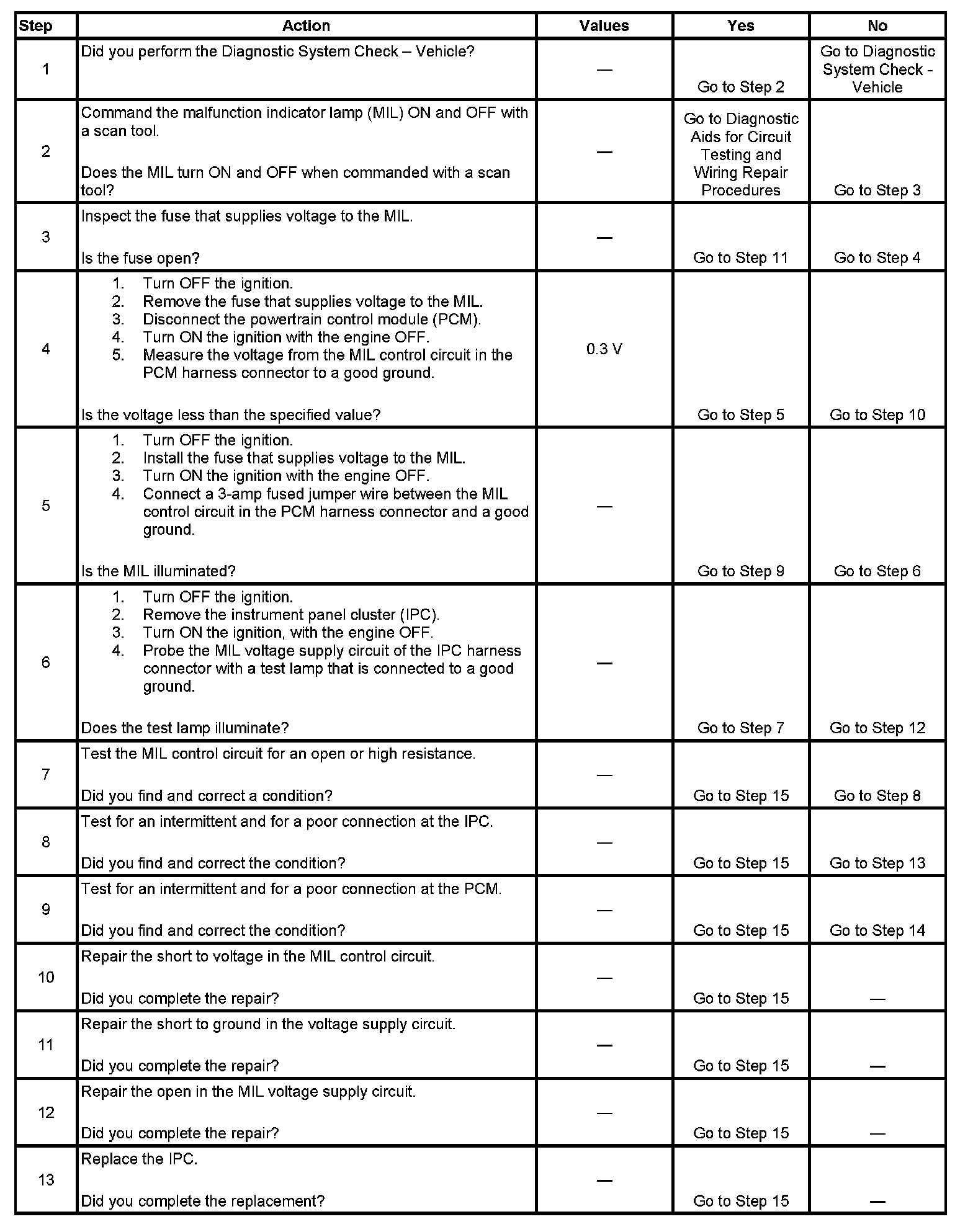 Voltage is supplied directly to the malfunction indicator lamp (MIL). The powertrain control module (PCM) turns the MIL ON by grounding the MIL control circuit. There should be a steady MIL with the ignition ON and the engine OFF.