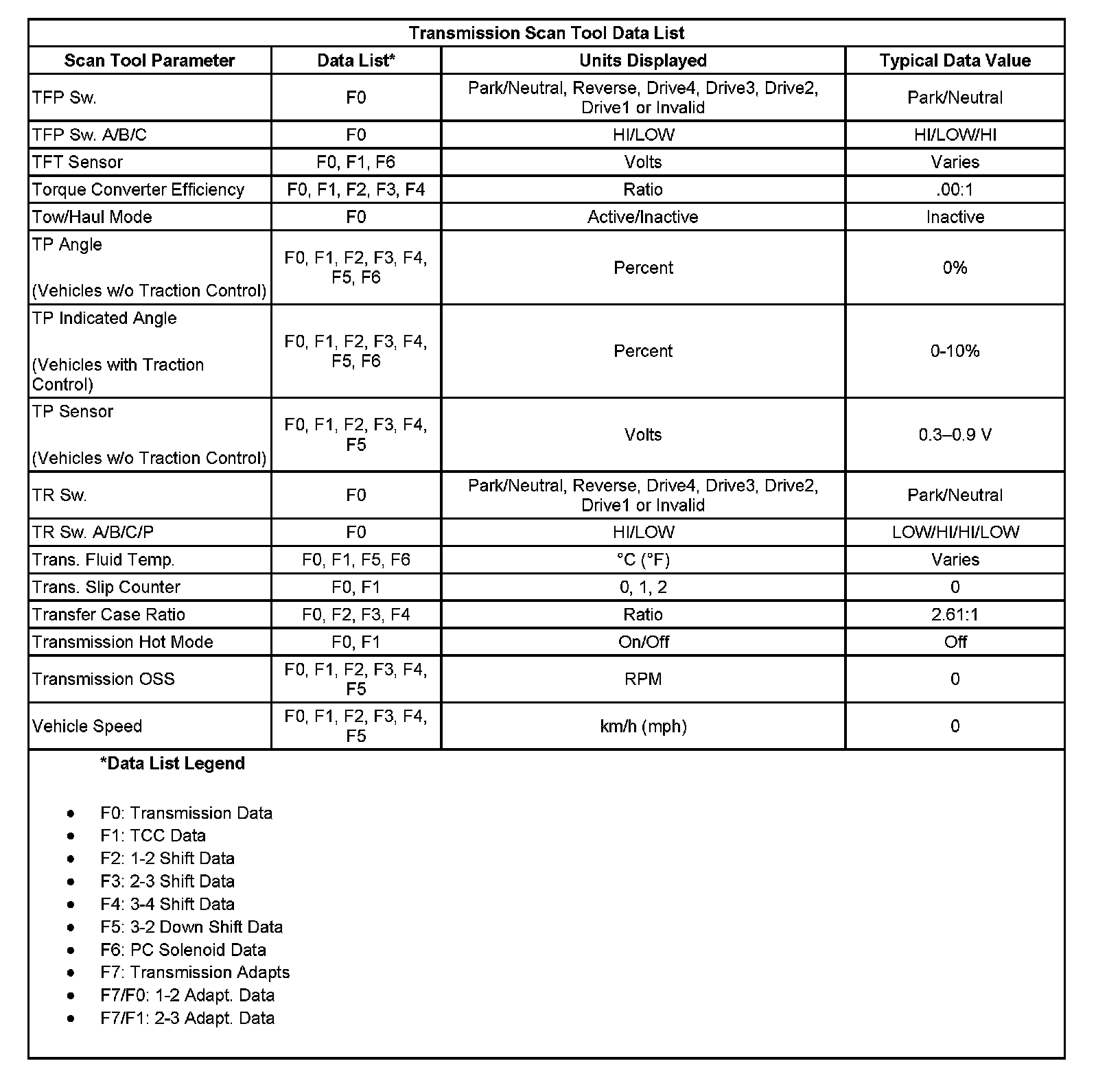 Only the parameters listed below are used in this manual for diagnosing. If a scan tool displays other parameters, the values are not recommended by General Motors for use in diagnosis.