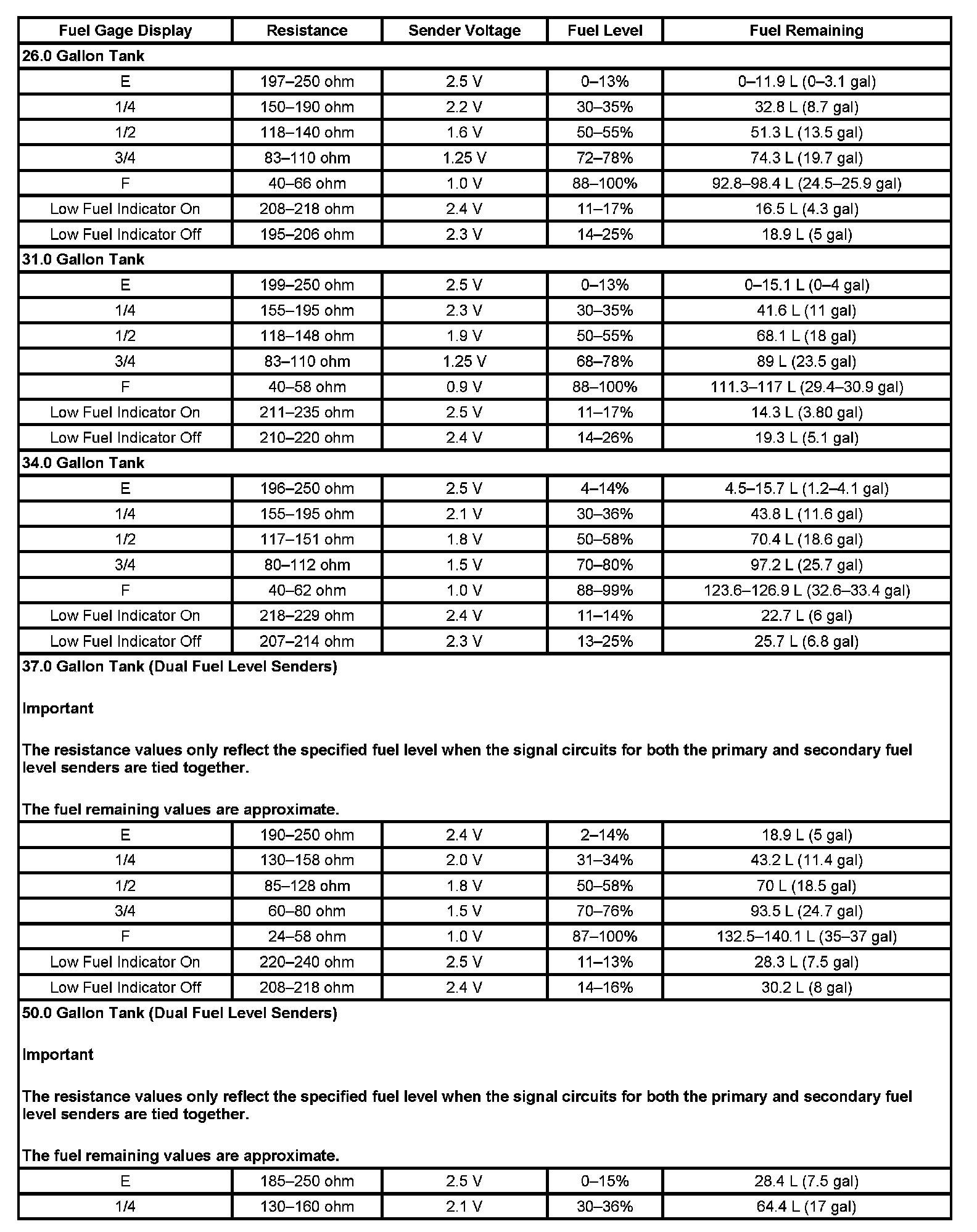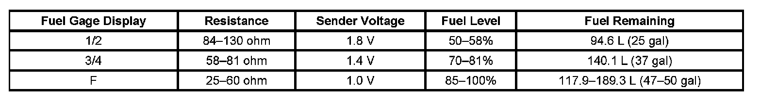 The information in this table is intended for use with the J 33431-C Signal Generator and Instrument Panel Tester. The fuel level sensor values represent the test values to be used on the Signal Generator to drive the fuel gage display to the indicated positions. Vehicles that require more than one fuel level sensor calculate gage position from many possible resistance combinations of fuel levels between the two tanks. Therefore, the values in the table may not correlate directly to readings taken from the vehicle primary or secondary sending units.