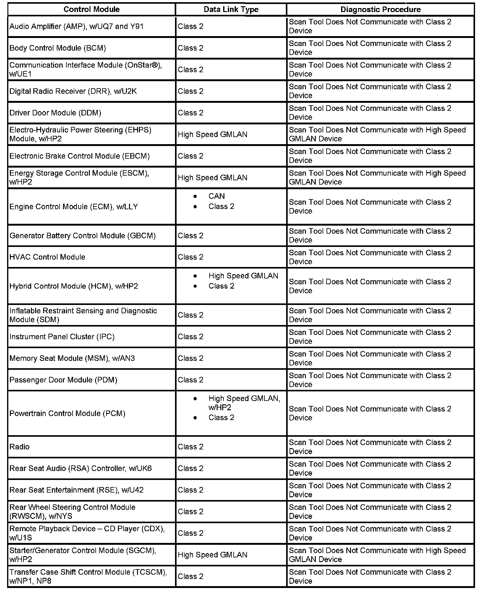 This table identifies which serial data link that a particular module uses for in-vehicle data transmission. Some modules may use more than one data link to communicate. This table is used to assist in correcting a communication malfunction between the control module and the scan tool. For the description and operation of these serial data communication circuits refer to Data Link Communications Description and Operation.