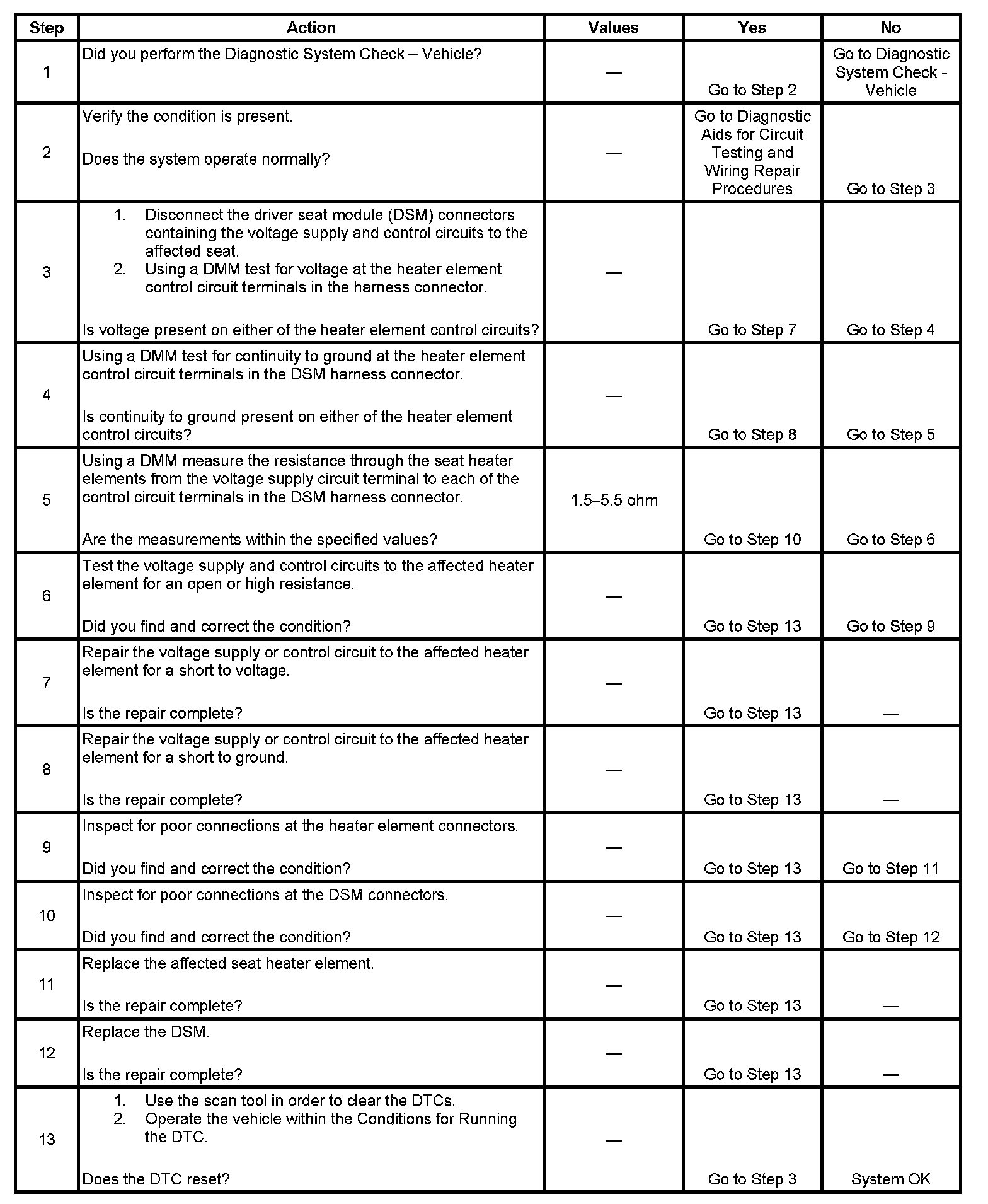 The DSM determines by monitoring the heater element control circuits that a short to voltage, short to ground, or open condition exists.