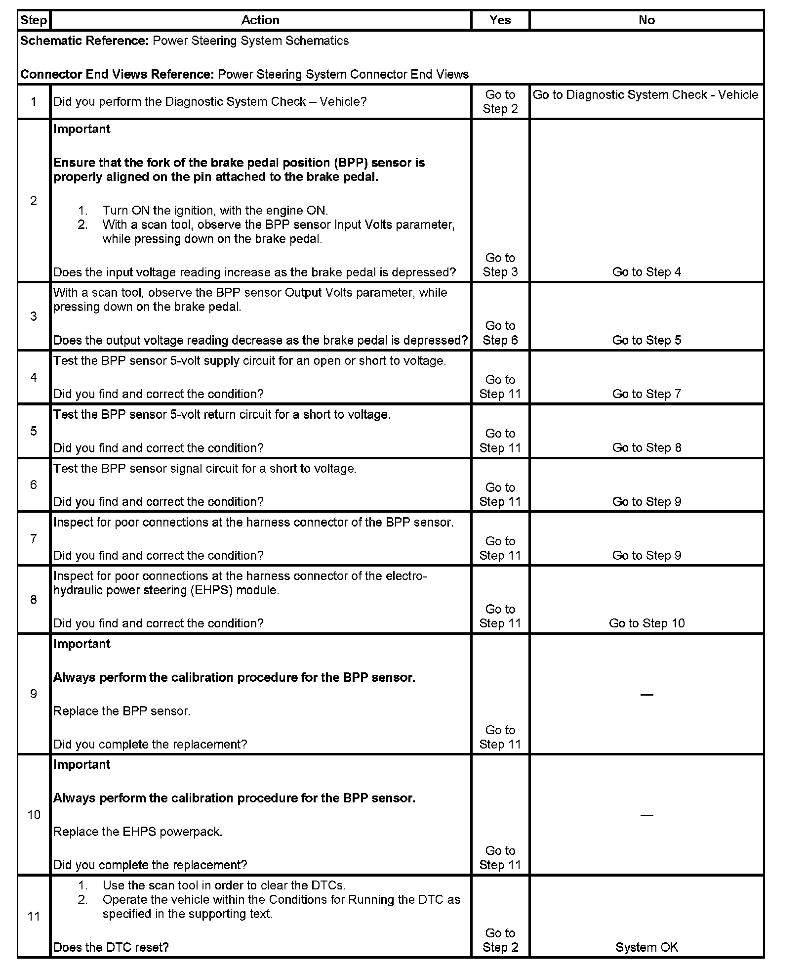 The EHPS excites the BPP sensor with the 5-volt reference and can determine the brake pedal position by reading the signal circuit output. The brake pedal travel is physically constrained to only use a portion of the BPP sensor. A portion of the BPP sensor is reserved for circuit low and circuit high guard bands. This diagnostic, DTC C0284, is used to determine if the sensor output reports a voltage in the high guard band.