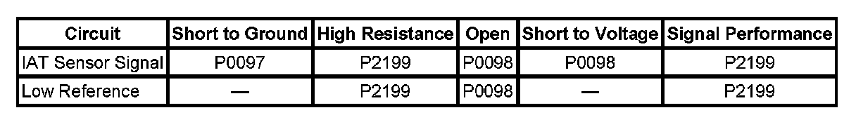 The IAT sensor 2 is less than -39°C (-38°F) for more than one second. This is equal to or more than 4.86 volts on the IAT signal circuit as measured by the ECM for P0098.