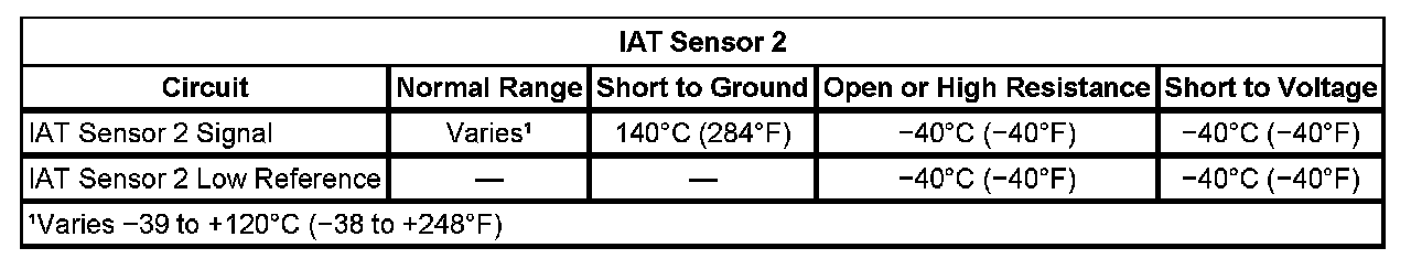 - If the IAT Sensor 2 parameter is more than -39°C (-38°F), test the IAT sensor 2 signal circuit for a short to ground, low reference, or faulty ECM.