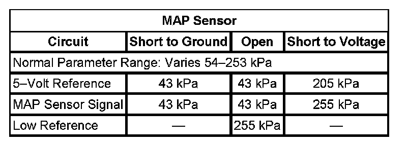 - If the MAP Sensor parameter is less than 253 kPa, then test the MAP sensor signal circuit for the following: