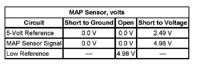 1. With the ignition ON, the engine OFF, and the MAP sensor disconnected, use a DMM and measure for a voltage range of 4.8-5.1 volts between the MAP sensor 5-volt reference circuit and a good ground.