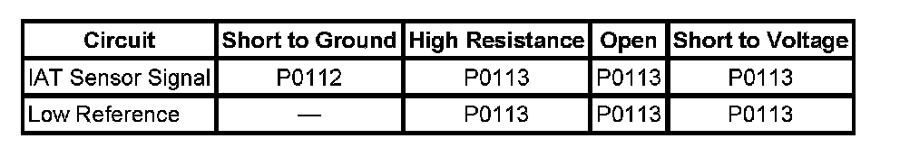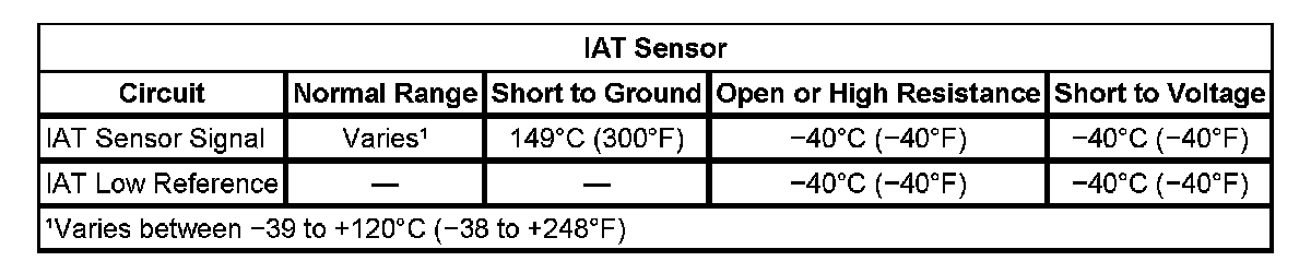 The IAT Sensor parameter is less than -39°C (-38°F) for more than one second. This is equal to more than 4.8 volts on the IAT signal circuit as measured by the ECM.