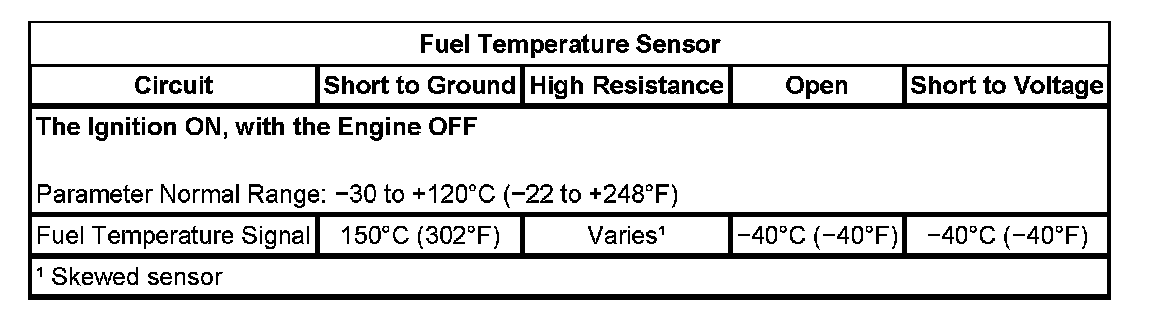 Turn ON the ignition and observe the Fuel Temperature Sensor parameter with a scan tool. The fuel temperature parameter should be within the operating range.