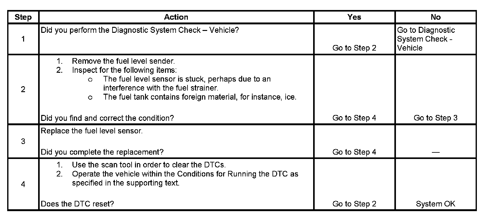 This diagnostic tests for a stuck fuel level sensor signal. The PCM sets this DTC if the fuel level sensor signal appears to be stuck based on a lack of signal variation expected during normal operation.