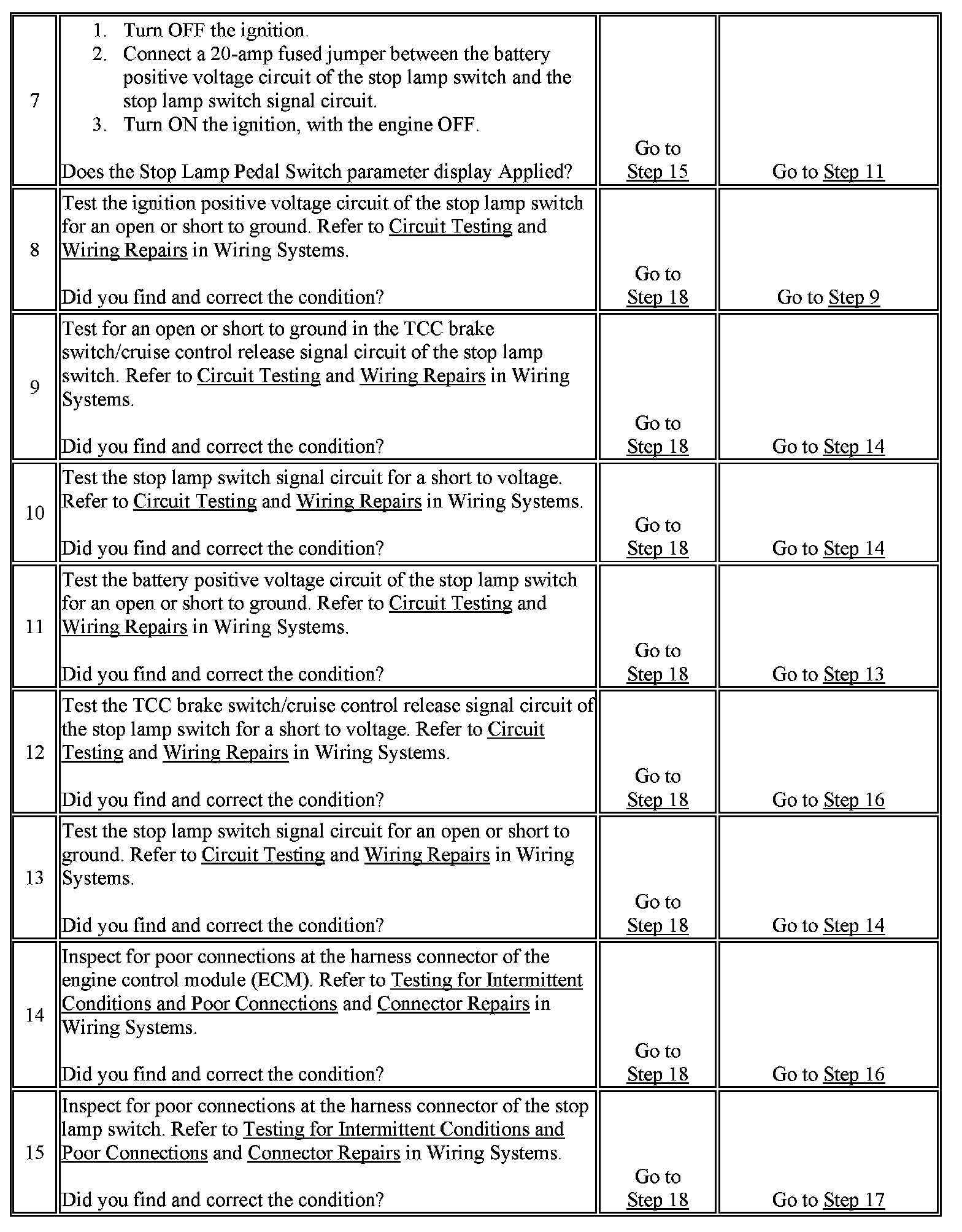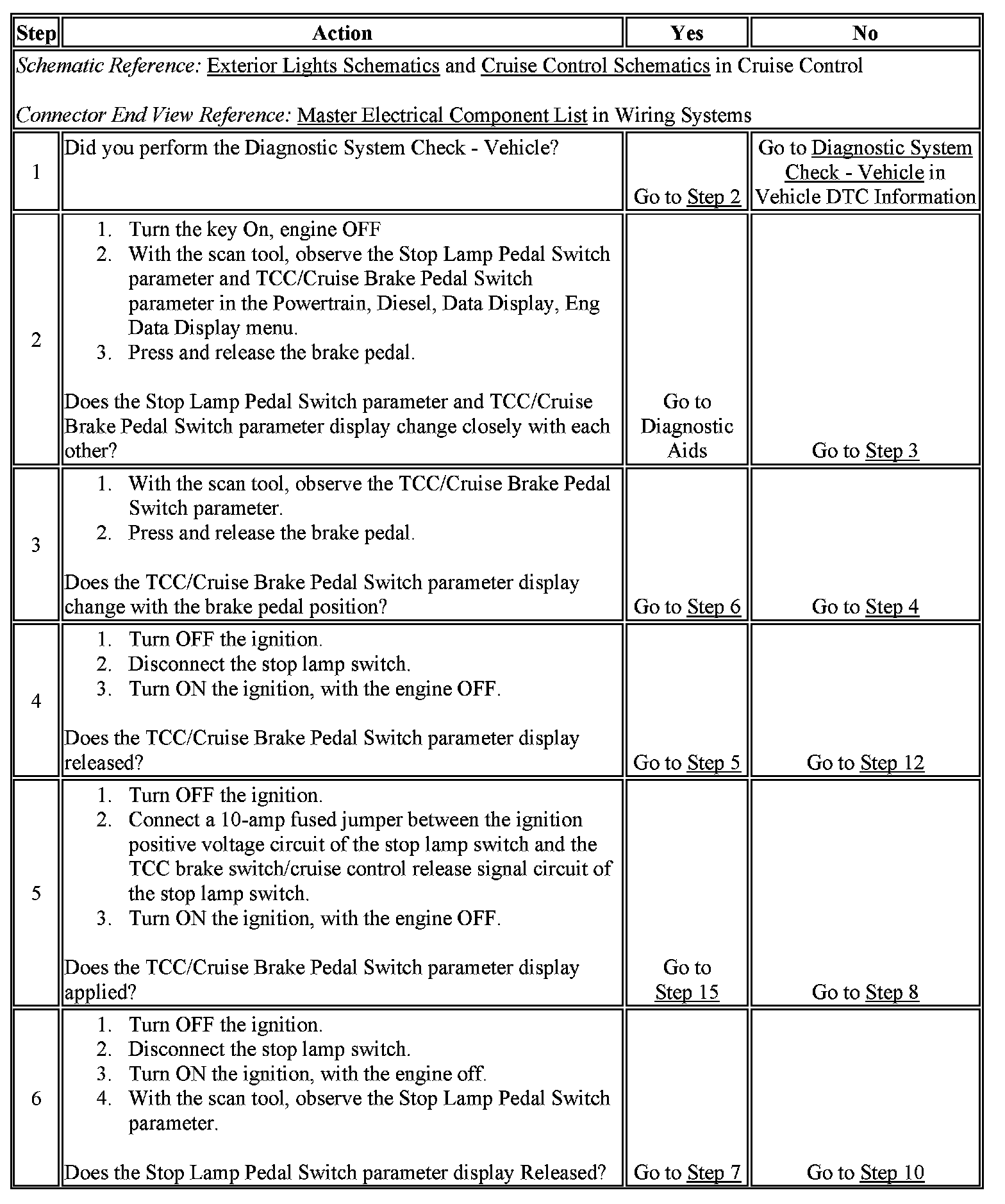 The engine control module (ECM) monitors the stop lamp switch signal circuit and the torque converter clutch (TCC) brake switch/cruise control release signal circuit every 100 ms. The ECM monitors the status of the stop lamp switch signal circuit and the TCC brake switch/cruise control signal circuit to see if they match when the brake pedal is pressed or released.