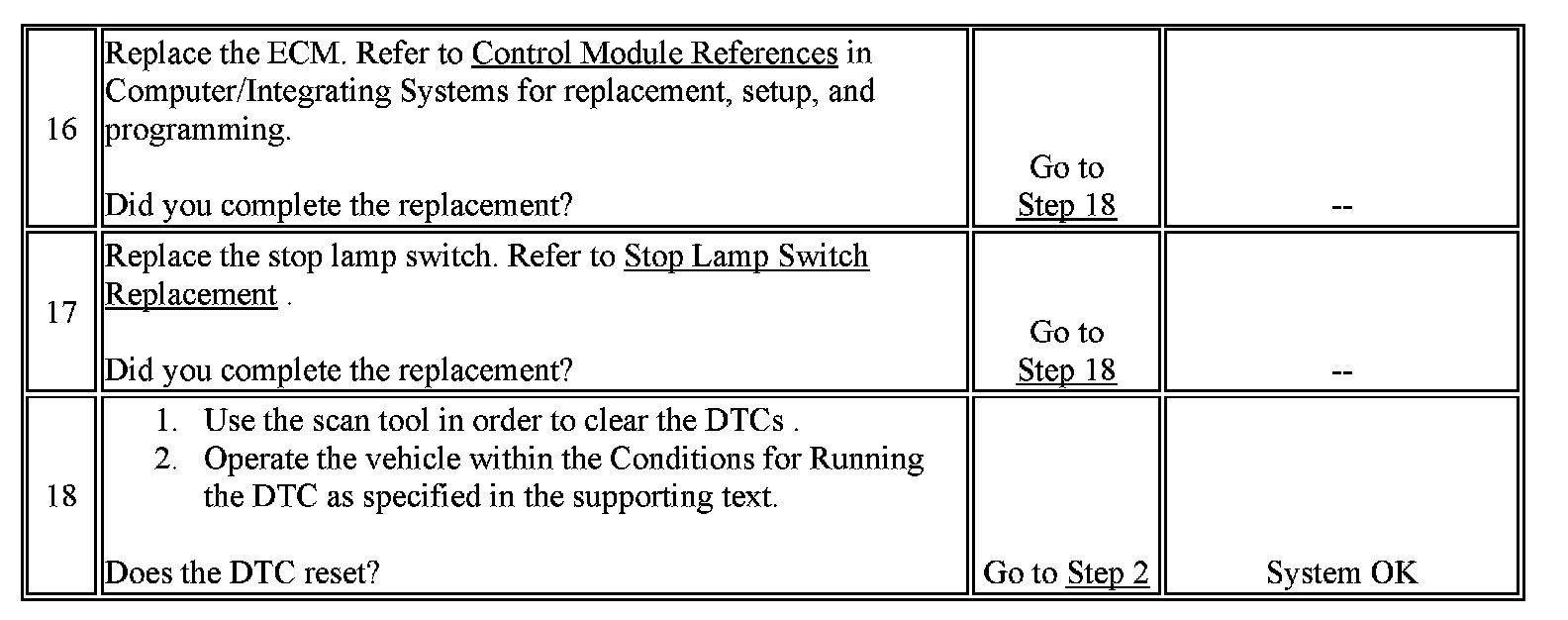 - The DTC will clear when the status of the stop lamp switch input to the ECM, and the TCC brake switch/cruise control input to the ECM match for at least 2 seconds continuously for both the pressed position and the released position.