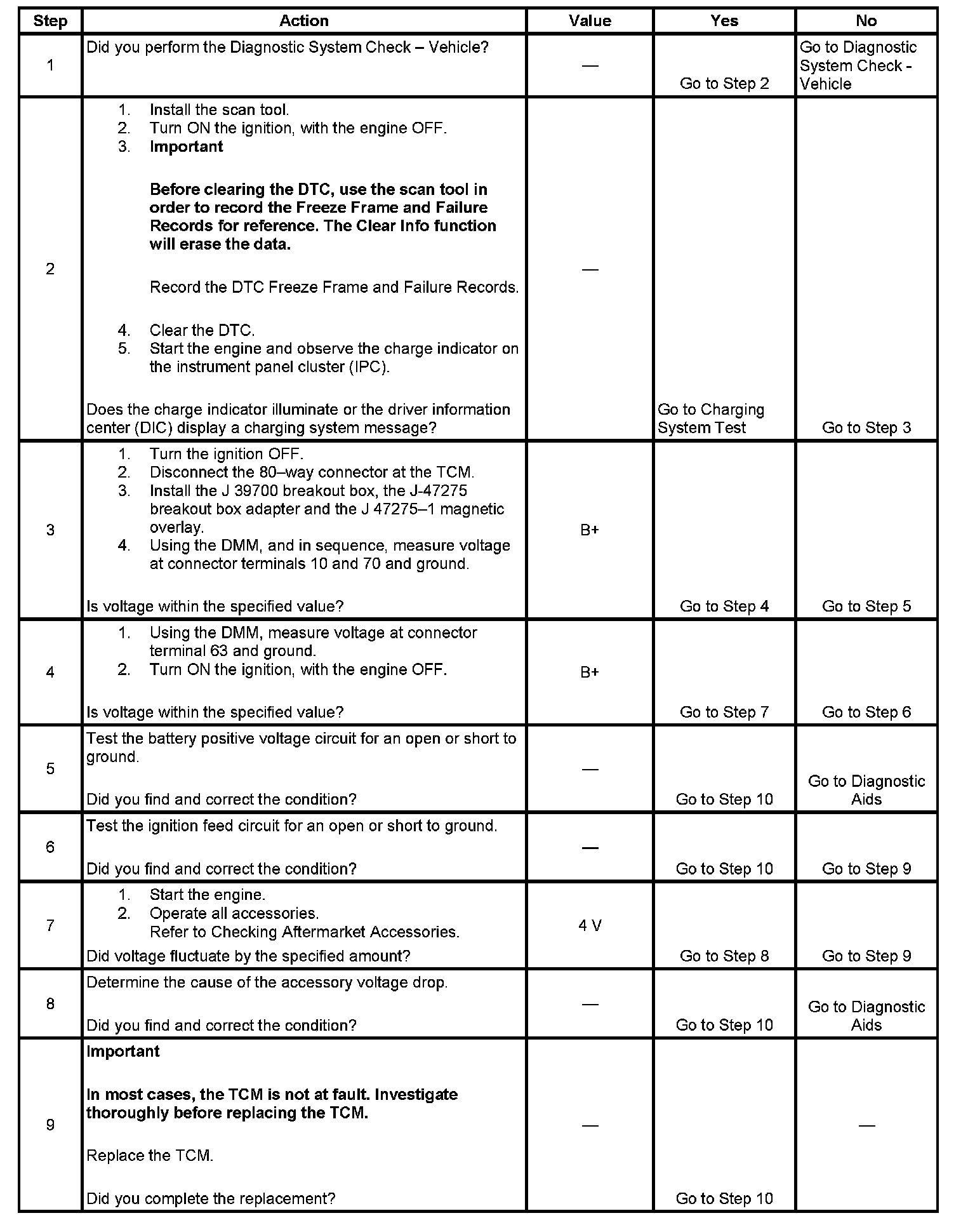 The numbers below refer to the step numbers on the diagnostic table.