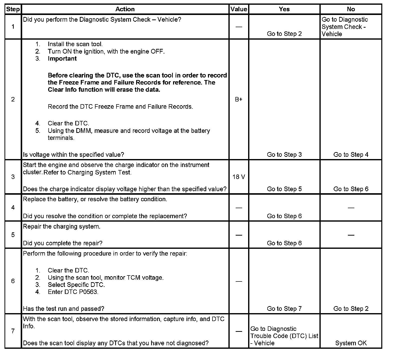 The numbers below refer to the step numbers on the diagnostic table.