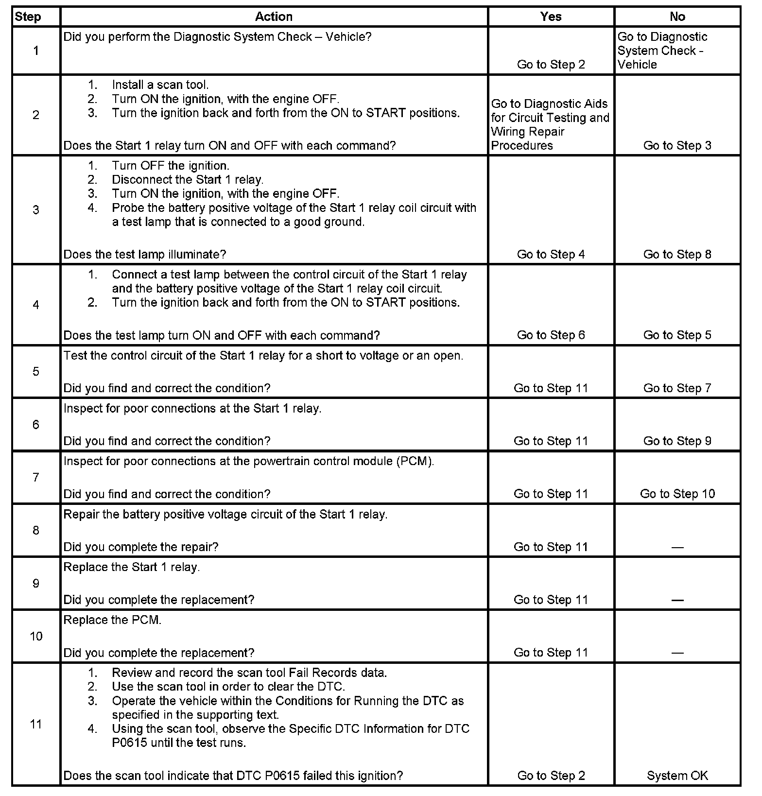 The powertrain control module (PCM) uses output driver modules (ODMs) to control many functions of the engine. The ODMs supply the ground path for the PCM controlled device when the PCM commands the device ON. Each ODM is able to control several outputs. The PCM monitors the ODMs for circuit conditions that are incorrect for the commanded state of the ODM. If the PCM detects an improper circuit condition in the ODM that controls the starter relay, DTC P0615 will set.