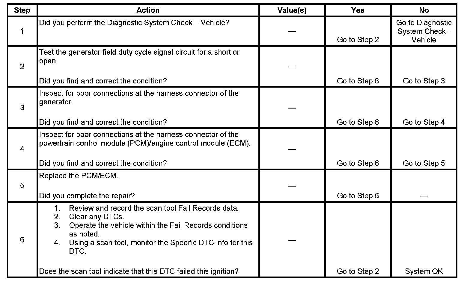 The ECM monitors the state of the generator field duty cycle signal circuit. When the key is in the RUN position and the engine is OFF, the ECM should detect a duty cycle near 0 percent. However, when the engine is running, the duty cycle should be between 5 percent and 100 percent. The ECM monitors the PWM signal using a key ON test and a RUN test. During the tests, if the ECM detects an out of range PWM signal, DTC P0622 will set. When the DTC sets, the ECM will send a class 2 serial data message to the instrument panel cluster (IPC) to illuminate the charge indicator.