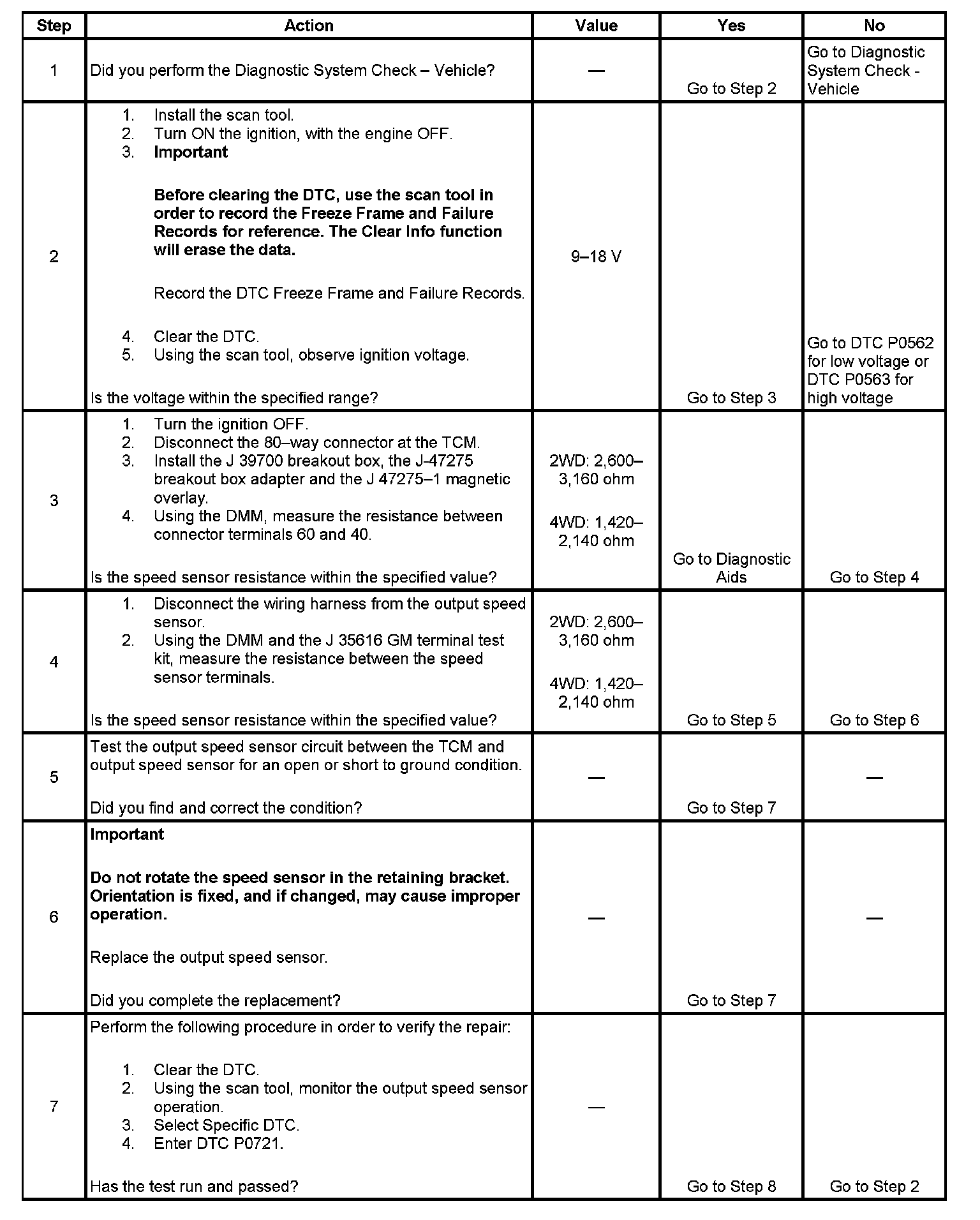 DTC P0721 sets when the TCM detects an unrealistically large change in output speed or if excessive noise is present in the output speed sensor circuit.