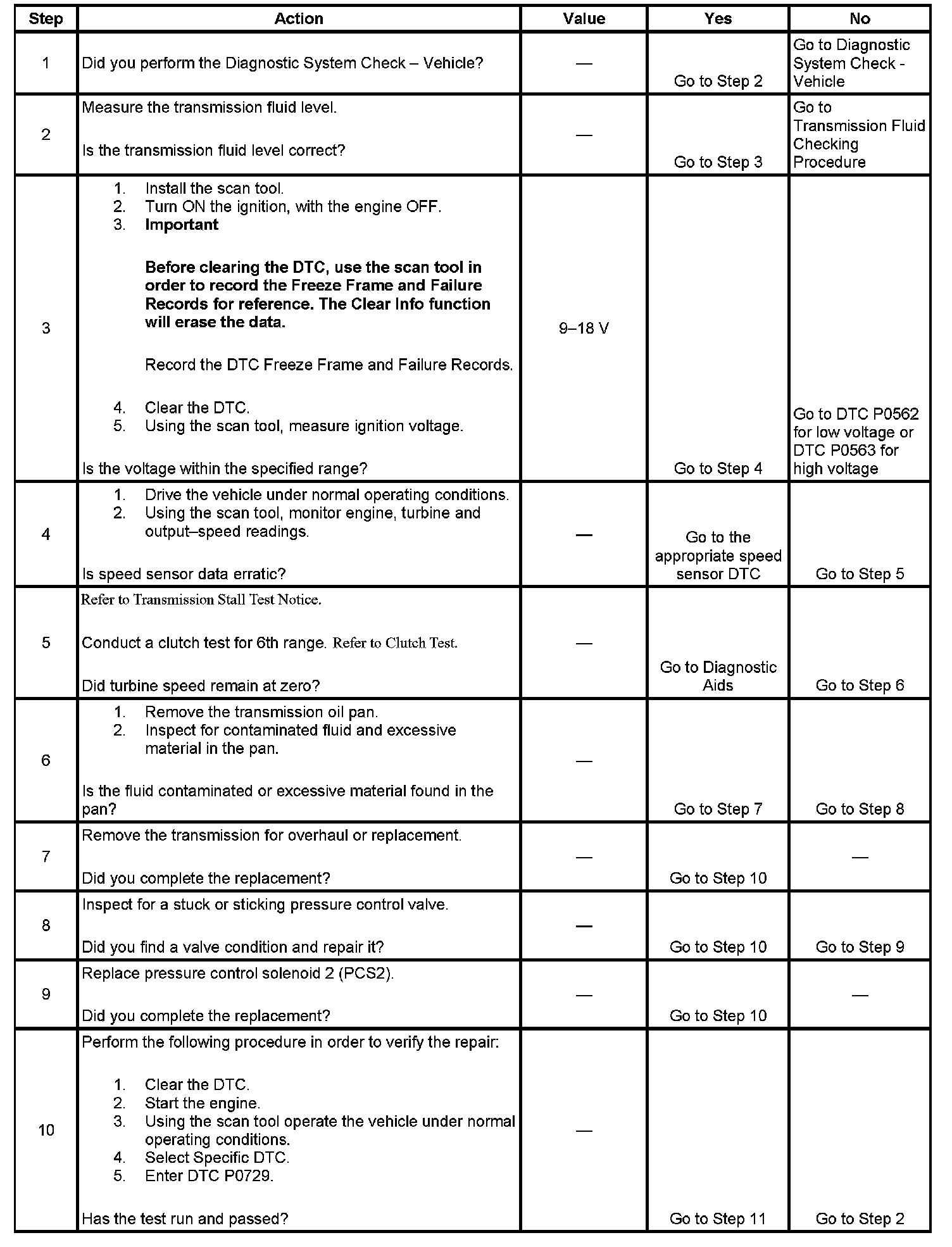 DTC P0729 sets when the calculated 6th range ratio, steady state, differs from the known 6th range ratio.