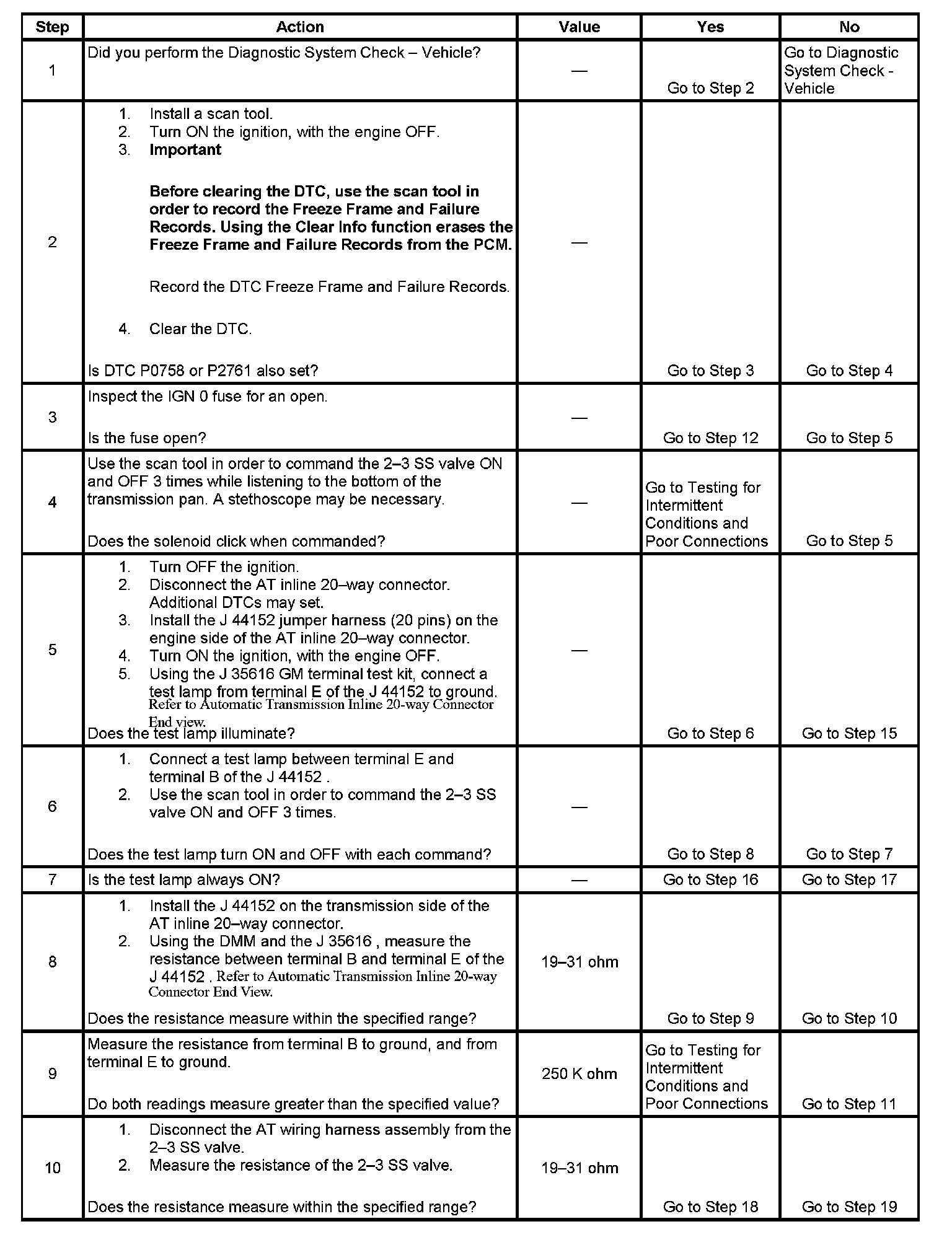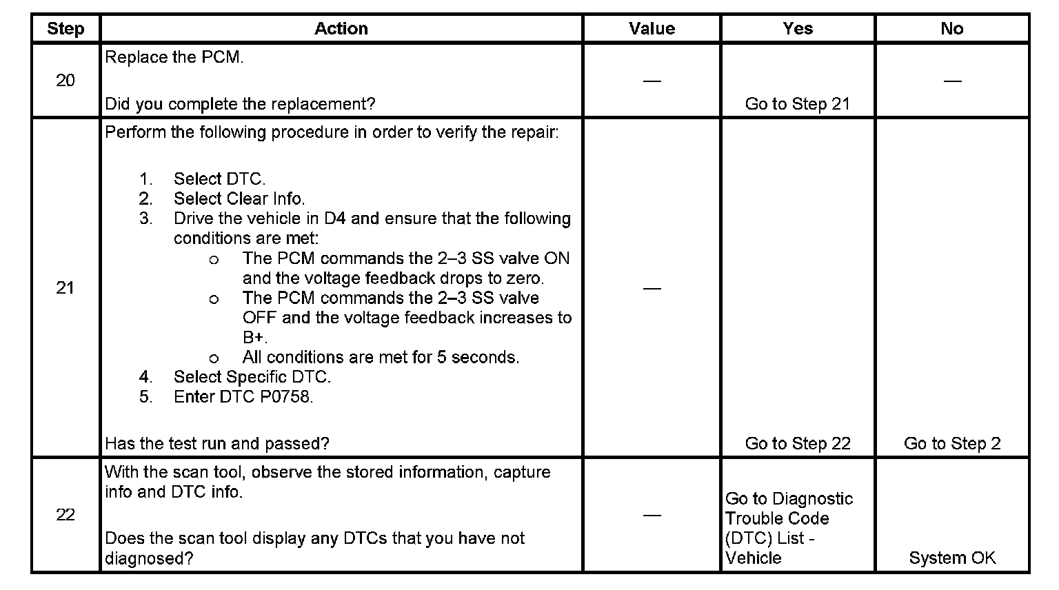 If the PCM detects a continuous open or short in the 2-3 SS valve circuit or the 2-3 SS valve, then DTC P0758 sets. DTC P0758 is a type C DTC. For California emissions vehicles and vehicles under 8,600 GVW, DTC P0758 is a type A DTC.